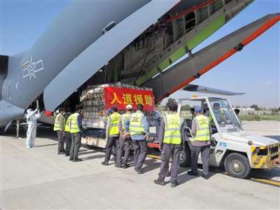 满载着救灾物资的中国空军运20飞机,抵达了喀布尔国际机场。