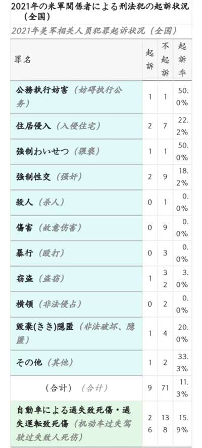 其中,所有的故意杀人(1起)、故意伤害(9起)、殴打(3起)和非法侵占(2起)罪都完全没有被起诉。在11起强奸案中,有9起没有起诉。在33例盗窃案中,只有一起被起诉。在9起非法入侵住宅案中,也只有2起被起诉。而不属于一般刑事犯罪的机动车过失致人死伤案,164起案件中有138起未被起诉,起诉率只有约16%。相比之下,即使近年来全日本范围内的一般刑事犯罪的起诉率只有30%之低,但是仍然比美军犯罪的起诉率高出两倍。