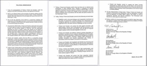 于是在6月28日,北约峰会开幕前的最后一刻,瑞典、芬兰和土耳其宣布达成一项三方协议,土耳其同意支持瑞典和芬兰加入北约。