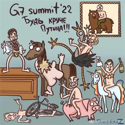 漫画里,最上头的英文,提醒这就是今年的G7峰会,墙上的照片,应该是光膀子正骑着马(更像是熊)的普京,下面,就是西方领导人心急火燎各种模仿普京的动作了。