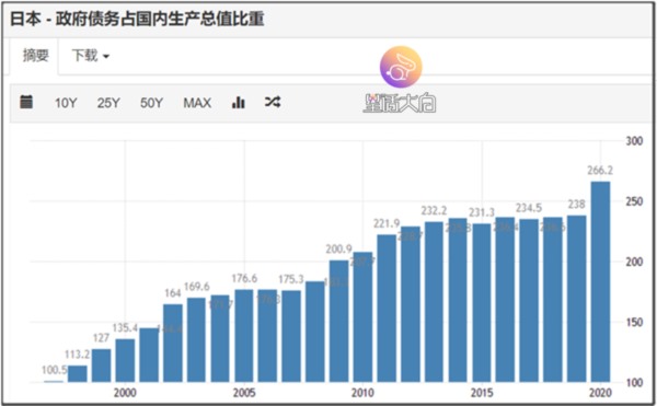 而且日本政府债务占GDP比例是世界上主要经济体里最高的,达到了266%。