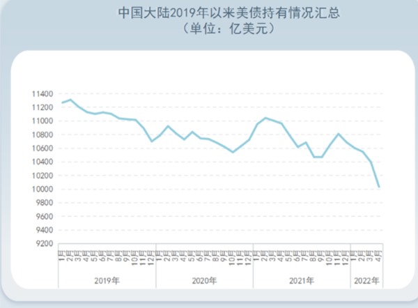 我们在4月份抛售了362亿美元的美债,这是相当大力度的抛售,这使得我们美债持有规模,已经降低到2010年以来最低的1万亿美元大关。