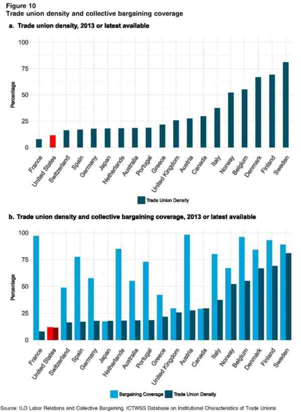 众所周知,美国的工会已经衰落几十年了。[68]然而,大多数人往往低估了美国与其他大多数富裕民主国家之间的差距。图10a提供了工会密度的对比视图(有多少人属于工会?)这也证实了美国在工会成员人数方面接近垫底。然而,当我们添加劳资谈判协议覆盖范围的数据时,情况发生了巨大的变化(即,有多少人受由工会谈判得到的合同保护,无论他们自己是否属于工会?)因此,图10b生动地记录了其他工会会员人数同样低的国家,他们中的大多数实现了高得多的谈判协议覆盖率。[69]