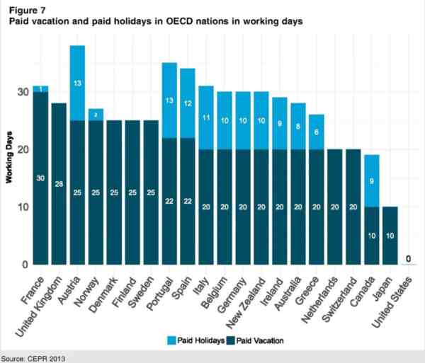 图7提供了另一项关于福利的比较视角,即带薪假期的权利。在这里,我们看到美国再次是一个极端异类——由联邦政府保障的带薪假期甚至比日本还要少——在日本,有如此多的人因为过劳死,以至于他们发明了一个词来形容它。[55]