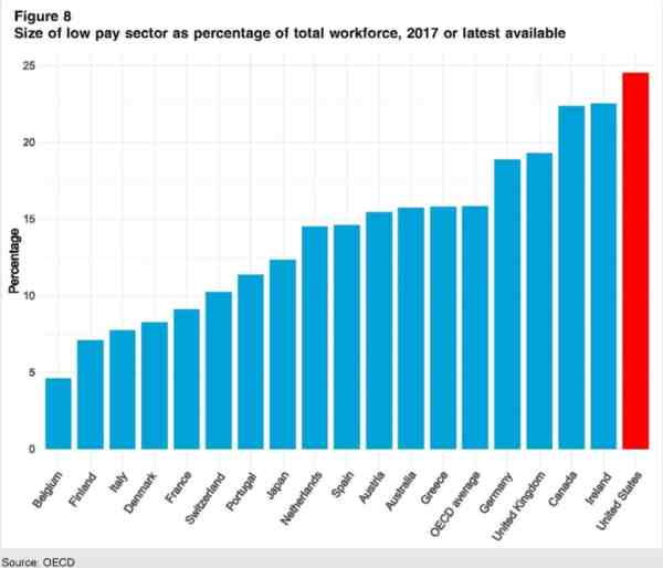 评估劳动力市场不稳定性的另一种方法是比较不同国家的低薪部门的规模。在这里,我们将触及当代美国劳动力市场的一个奇怪运作方式,尤其是这样一道谜题:在失业率创纪录的处于低位的情况下,真实工资为何停滞?尽管近十年来失业率稳步下降,但工资水平保持不变。事实上,在过去两年里,工资增长率有所下降,从2.8%降至2.7%,尽管失业率从4.9%降至了3.9%。[56]图8提供了关于富裕民主国家低薪部门规模的最新可用数据,低薪被定义为「总劳动人口中收入低于中位数三分之二的那些人」。数据表明,在「低工资工作的发生率」方面,美国排在富裕民主国家的前列。经济学家们越来越多地将低失业率和工资停滞的矛盾归咎于雇主的权力过大。他们或者通过当地劳动力市场的垄断权力,或者通过特定的策略(如竞业条款[non-compete clauses]、不挖角协议或强制性仲裁条款)来抑制劳动力的竞争,包括低技能劳动力。[57]