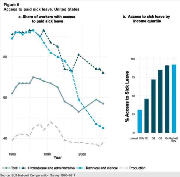 图6a显示,劳动力市场上的一些群体获得带薪病假的机会急剧下降。它显示了美国劳工统计局(Bureau of Labor Statistics)公布的自1980年至今带薪病假的数据。最引人注目的是「技术和文秘人员」(这一类别包括我一直在谈论的一些低技能服务行业的不稳定劳动者),他们获得这一核心福利的机会从1980年代中期开始快速下降,到90年代末又一次沉底。[54]图6b显示了涵盖整个劳动力市场的数据。它表明在美国,收入越低,享受带薪病假的可能性就越小。