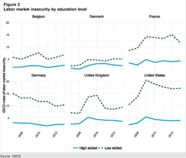 这些新形式的不安全感还表现为经常性失业——劳动者在提供低水平就业保护或没有就业保护的工作之间流动。为了比较这一点,图3根据经合组织(OECD)对劳动力市场不安全的衡量标准,将美国与其他几个国家进行了比较,显示了高技能和低技能劳动者的数据。[37]正如人们所料,低技能工人比高技能工人在劳动力市场上更不安全。然而,同样突出的是,在一些国家(比利时和丹麦),社会政策缓解了这一差距,将低技能工人在劳动力市场的不安全程度降低到与高技能工人没有太大区别的水平。美国突出的特点是,总体而言,低技能工人在劳动力市场上的不安全感相对较高,而且他们与高技能工人之间的差距如此之大。