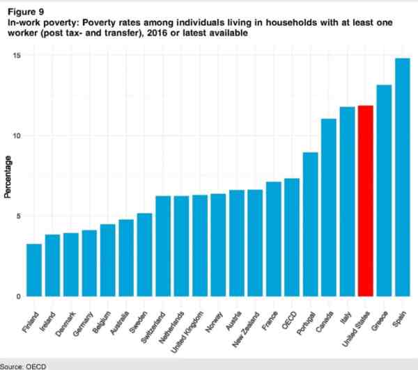 最后,我们可以通过检查全国范围内的在职贫困(in-work poverty)水平来评估劳动力市场的不稳定性。该指标指的是至少从事一份工作但其就业收入不足以让他们摆脱贫困的人数。图9给出了经合组织的数据,计算了税后和转移支付后的在职贫困水平。我们看到美国在这方面的表现也是最差的。此外,在职贫困水平相当的国家——意大利、希腊和西班牙——都是欧洲最脆弱的经济体之一,失业率分别为11%、20%和15%。[58]