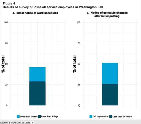 同样清楚的是,特别是对于那些不能自由选择这类工作的工人来说,这种就业灵活性并不是真正的双向交易。零售业和食品服务业等行业的雇主可以使用新技术优化日程安排;在极端情况下,他们会临时通知工人进场(或下班)。对劳动者来说,这通常意味着他们在全职工作的条件下获得兼职工作的报酬。[38]图4a和4b基于对华盛顿特区低技能服务业员工的调查——零售业、餐饮业和其他服务业。[39]左边的数字显示了他们的工作日程提前多少时间发布(深色表示提前不到三天,浅色的不到一周)。如图所示,近50%的受调查者只在一周前或更短时间内收到了通知,告知他们预计何时上班。右边的数字显示,即使在最初公布工作时间后,雇主也会经常做出进一步改变。[40]结果是,这些劳动者中有很大一部分在不到24小时内才得到通知。[41]