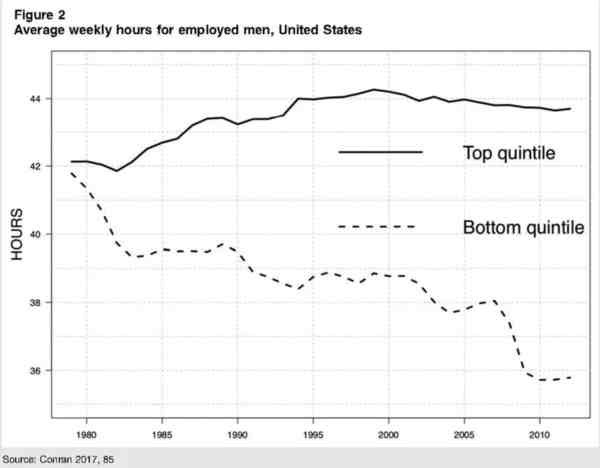 因此,例如尽管失业率很低,但就业不足实际上是美国的一个重大问题。图2出自我以前的一位学生詹姆斯·康兰(James Conran)的论文。[32]他追踪了1980年以来美国收入最高和最低的四分之一就业男性每周平均工作时间的演变。[33]他的研究表明,在1980年代,收入最高阶层的男性工作时间有所增加,此后一直保持在相当高的水平。然而,最令人震惊的是,在这段时间里,收入最低男性群体的工作时间显著下降,首先是在1980年代初大幅下降,然后是金融危机后的又一次大幅下降。这一现象是康兰所说的大反转(the great reversal)的一部分,收入梯队顶端的人——我们过去认为是有闲阶层——现在工作时间越来越长,而低薪劳动者往往长期处于就业不足状态。