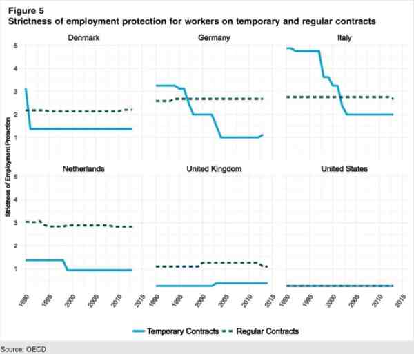 因此,要评估不稳定性,我们必须超越失业统计。在欧洲,一项广泛使用的测量工作安全的指标是「有多少人在根据临时雇佣合同工作」。之所以关注这一点,是因为在欧洲,这些签了临时合同的劳动者没有受到法律或集体合同所规定的那种强有力的就业保护——通常适用于那些签订常规就业合同的劳动者。[47]经合组织制作了就业保护严格程度的指数,分数越高,就业保护就越有力(或对雇主施加的限制越多)。[48]如图5所示,在欧洲,由于许多政府放松了对临时合同的使用限制,工作的不安全性有所上升。然而,该图清楚地表明,美国的主要情况是,在这个国家没有人有多少工作保障;他们从来就没过。在国际比较视野下,因为雇主可以很容易地雇用和解雇他们的工人——甚至是那些有正规合同的工人——美国脱颖而出。[49]因此,在就业保护方面,美国的所有工作都比欧洲大多数国家更不稳定。[50]
