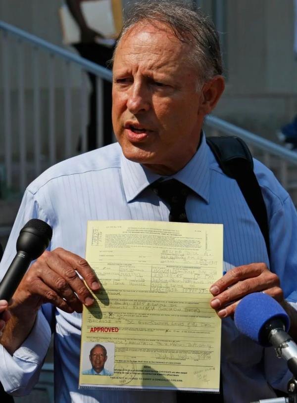 2008年8月18日,在华盛顿特区最高法院,艾克·海勒手持哥伦比亚特区警察局持有新批准的枪支许可证与记者交谈。