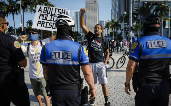 当地时间2021年5月25日,美国弗罗里达州迈阿密,白人至上组织“骄傲男孩”的成员与“黑命攸关”支持者在纪念弗洛伊德去世一周年的活动上发生争执。