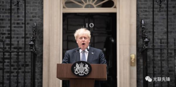 英国首相鲍里斯·约翰逊在伦敦唐宁街10号外宣读声明,正式辞去保守党党首的职务。图片日期:2022年7月7日,星期四。