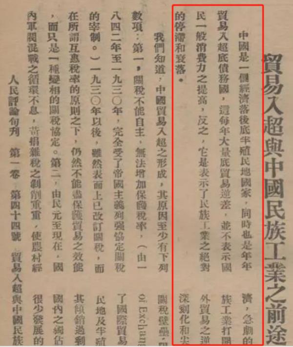 “中国是一个经济落后的半殖民地国家,同时也是一个年年贸易入超的债务国,这每年大量的贸易逆差并不表示国民一般消费力之提高,反之,它是表示了民族工业之绝对的停滞和衰落。”