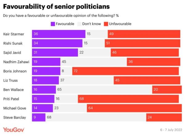 当日的民调显示,约翰逊的净好感度已经降到历史最低点 -53,这一数字已经远低于保守党下任党魁的有力竞争者和现任工党领袖斯塔莫的支持率和净好感度。
