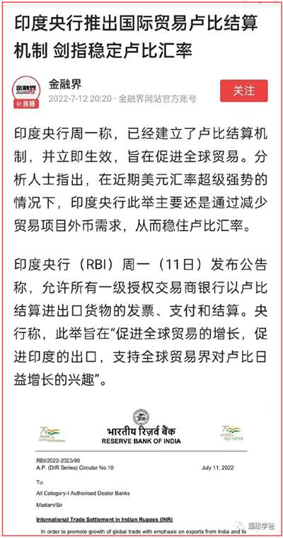7月12日,印度央行对外宣布,推出国际贸易卢比结算机制,并立即生效。有不少朋友把这个消息推给我,刚开始我没在意,因为我看成了卢布结算。