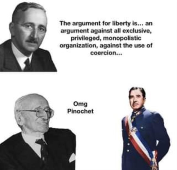 为了保卫自己心目中的经济自由,那哈耶克对于天底下反共的独裁者可是极尽吹捧翼赞之能事,包括但不限于常凯申、皮诺切特等物……