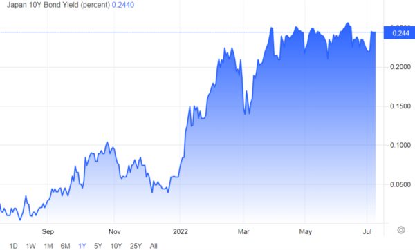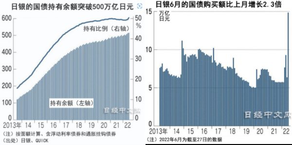 当美联储宣布加息之后,国际投资客开始纷纷抛售日元国债,导致日本国债价格下跌,拉高日元国债收益率。日本10年期国债收益率一度拉升至0.25%以上。且市场预测日本将放弃货币宽松政策。然而,日本央行随后宣布坚决执行YCC政策(收益率曲线控制政策),由日本央行执行固定利率无限量购债操作,大把购入日本国债。随后,日本10年期国债收益率被控回0.25%以内,国债价格小幅拉升。当前,日本央行所持有的日本国债份额已经超过了50%,为全球主要经济体之最。