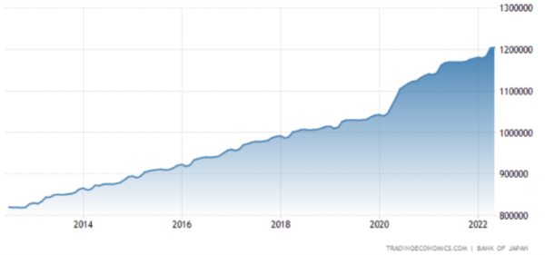 从上图可以看出,2022年初日本货币发行量明显抬升。这既是日本自1985年以来惯常执行的量化宽松政策的历史延续,也是安倍经济学的一贯方法,更是社会危机导致的必然结果。
