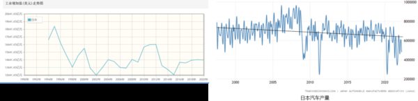 其中,日本工业增加值自1994年以来处于波动性下降状态,日本制造在新世纪出现颓势。尤其明显的是日本的支柱产业——汽车产业。日本汽车产量总体呈现缓慢下降趋势。造成这一现象的原因是:1.随着信息技术的发展和愈演愈烈的科技竞争,中、美、德等国的汽车行业均保有一定实力,尤其是中国车企在国际市场上的份额不断提升,日本车企竞争压力不断增大;2.日本在发展过程中遭到了美帝国主义的打压,广场协议是其中重要的一步;3.新能源汽车行业崛起,而日企在该领域尚无突出建树。这些因素均导致日本汽车行业在未来走向一定程度的衰落。而这一衰落究竟有多剧烈,将与新能源汽车行业的前景、化石能源使用的前景相联系。