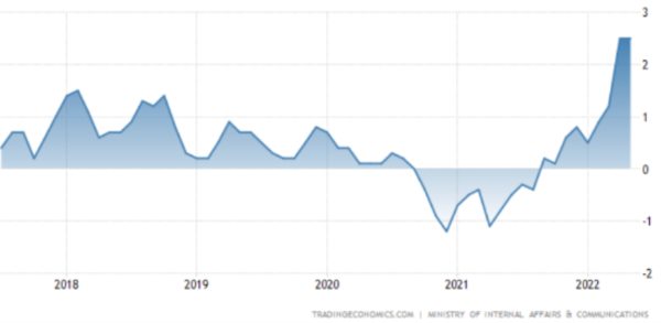 当前日本通胀水平仅拉升到2.5%左右。与日本以往的长期通货紧缩历史相比,本次通胀已达到极高幅度,然而在全世界的通胀趋势下,日本依然处于低通胀水平。并且,通货紧缩后带来的低度通胀反而对于社会消费有一定的刺激作用。对外,日元贬值在中短期内都利好出口,有利于抵御因俄乌战争所导致的国际收支失衡压力。 5.结语