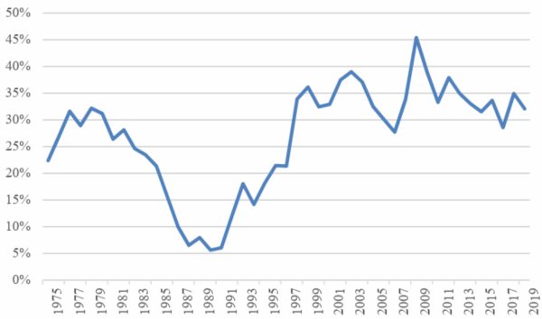 由于经济泡沫迅速扩张,日本居民部门和企业部门的负债率极速提升,违约风险加大。从1989年开始,日本央行决心“解决”泡沫经济,结束低利率政策,进行加息。1990年代日本房地产泡沫被刺破,经济瞬间陷入萧条。此时后悔晚矣。日本政府不得不再次拾起扩张性财政政策和印钞政策,下调利率,刺激投资。然而,由于受到日本泡沫经济刺破的影响,社会各界对日本经济发展前景普遍看低,人们更倾向于降低欲望以增加积累,应对社会经济的震荡,而不是扩大消费和投资。所以,这一次的刺激政策对日本经济的影响极为有限。也正是在这个时候,日本国债占GDP比重迅猛攀升,引起世界瞩目。