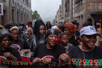 2021年5月26日,曾经的农场劳工弗里达·姆哈贝拉、露西亚·福斯特、古古·恩古巴内(从左到右)如今是反抗失地和低下的薪酬水平、工作条件并要求改善农场工待遇的活动家