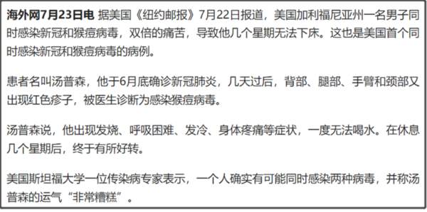 但我认为,按照美国当前疫情的严重程度来说,感染猴痘的人同时感染新冠,应该并不算是奇怪的事情。