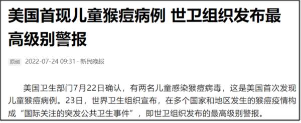 而且就在7月22日,美国有两名儿童确诊了猴痘,这是美国首次发现儿童猴痘病例。