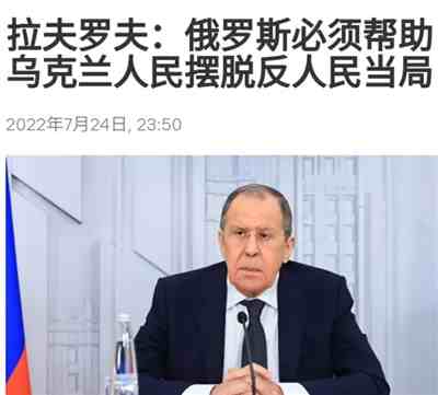 7月24日报道,拉夫罗夫在访问埃及时说了这样一段话,“我们对乌克兰人民表示同情,他们本应过上更好的生活。让我们感到遗憾的是,乌克兰的历史正在我们的眼前被破坏。此外,我们还对那些听信乌克兰及西方国家宣传的人表示遗憾,因为这种做法是让乌克兰成为俄罗斯‘永远的敌人’,这种企图不会成功。俄乌两国人民将继续生活在一起,我们会帮助乌克兰人民摆脱目前反人民和反历史的政权。”