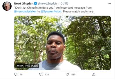 再比如在任期间窜访过台湾的、前众议院议长金里奇,接受采访时公开声称“支持佩洛西的台湾之行”。并且转发了赫谢尔·沃克一条视频,引用了其中一句话,“可别让中国把你恐吓住了。”