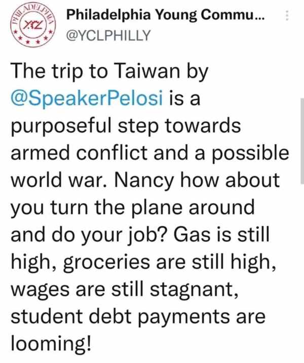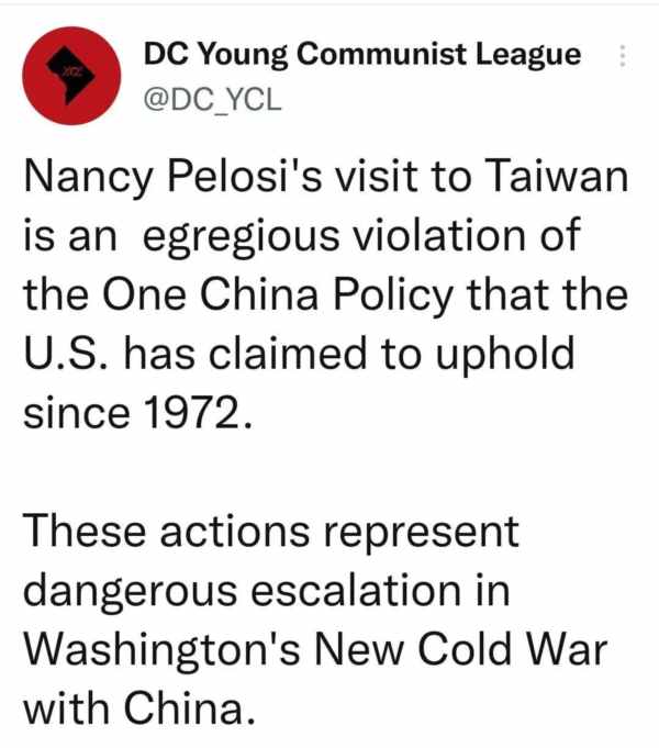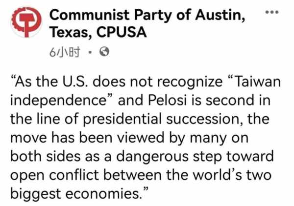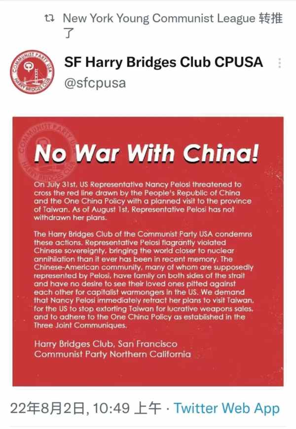 美国共产党哈里·布里奇斯 (Harry Bridges)支部谴责这些行为。众议员佩洛西公然侵犯中国主权,使世界比任何时候都更接近核毁灭。华裔美国人社区中的许多人在海峡两岸都有家人,他们不希望看到自己的亲人在美国为资本主义战争贩子而相互争斗。我们要求南希·佩洛西立即取消访问台湾的计划。我们要求美国停止向台湾售卖武器的这一有利可图的“勒索”,并坚持中美三个联合公报中确立的一个中国政策。