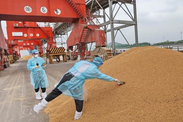 2022年5月10日,满载巴西大豆的货轮靠泊江苏南通嘉达码头,工作人员对进口大豆进行采样、检疫查验作业。图|视觉中国