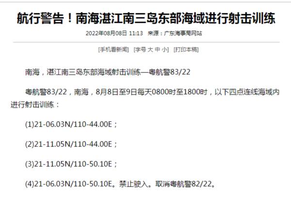 此外,广东海事局当天发布航行警告,8月8日至9日每天8时至18时,南海湛江南三岛东部海域进行射击训练,禁止驶入。