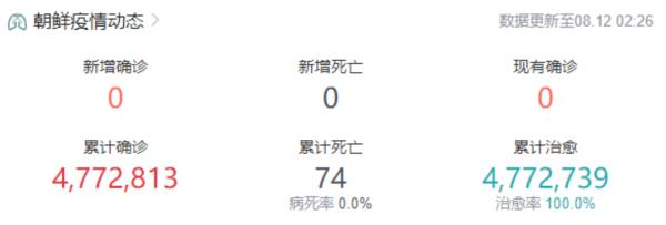 自5月12日以来,朝鲜通报称,朝鲜累计出现“发热病例”4772813例,死亡74例,治愈4772739例。自7月29日以来,朝鲜已经连续13日宣布没有新增的“发热病例”。