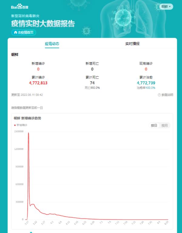 但英勇的朝鲜人民并没有被吓倒,而是迅速组织起来,在短时间内就实现了感染人数的迅速降低。8月11日,小兵通过百度百科搜索朝鲜疫情,“新增确诊”、“新增死亡”和“现有确诊”数据均显示为“0”: