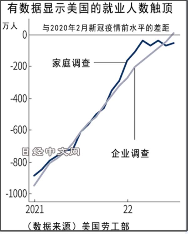 所以美国当前家庭调查的就业人数已经低于企业调查的就业人数。