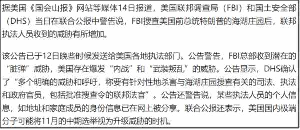 不过从FBI的公告描述,这更多只是针对FBI执法人员的“威胁”,距离我们所想的那种大规模内战,还比较遥远。