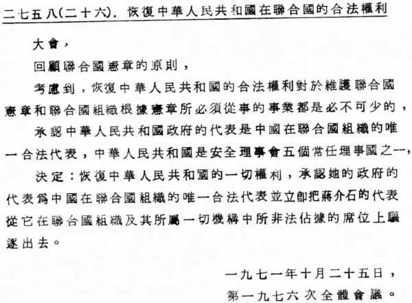 中国在联合国的席位长期由蒋介石政府代表占据。1971年联合国大会通过决议,中华人民共和国政府作为中国唯一合法代表得到认可,这整个过程只是代表权的变更,联合国对这个世界上仍然只有一个中国的认定没有改变。