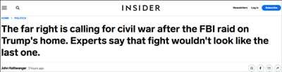 最大限度是内乱甚至内战:FBI搜查海湖庄园后,美国极端右翼组织打内战的口号就没听过。加州大学圣地亚哥分校政治学教授芭芭拉·沃尔特称,美国出现了内战的所有信号,而且出现的速度快得惊人。