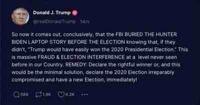 消息一出,特朗普立刻在媒体上发文表示,当初正是FBI在大选前掩盖了拜登之子的相关丑闻,因为他们知道如果不这么做,我就会轻松赢下2020年大选。