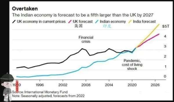 数据显示,印度在2021年4季度,GDP已经超过了英国,而且在今年1季度进一步扩大了领先优势。