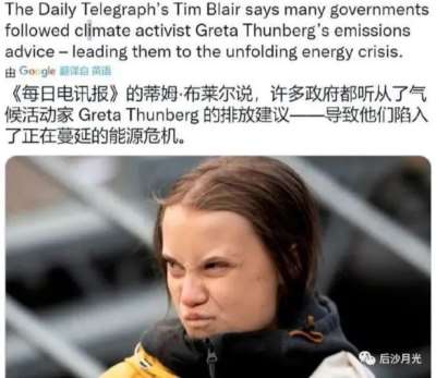 9月6日,英国《每日电讯报》发文称:很多国家政府就是因为听信了“环保少女”的排放建议,才导致他们陷入了目前正在蔓延的能源危机。该报还精心配了一张她的丑图。然后,“天空新闻网”等媒体也跟进转发。