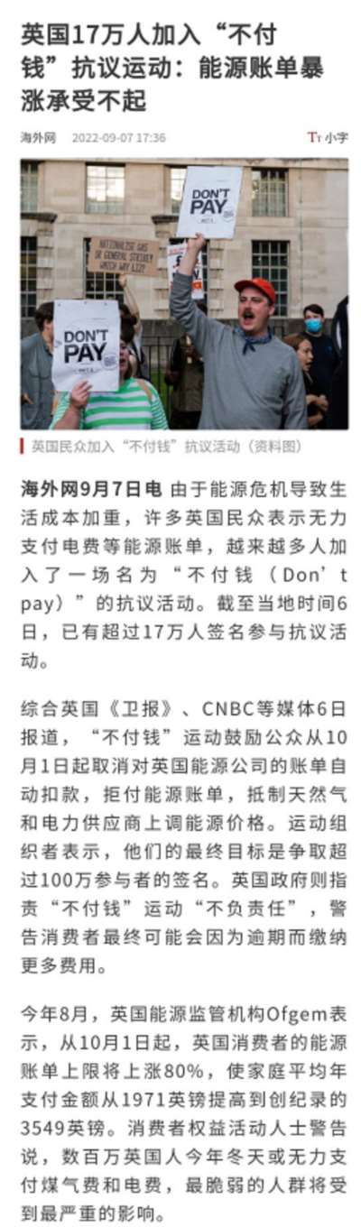 然后呢,特拉斯团队正在草拟计划,准备将英国典型家庭的年度电费和煤气费锁定在低于目前1971英镑(2300美元)的水平。同时,特拉斯正在敲定一项400亿英镑(约合460亿美元)的一揽子支持计划,以降低企业的能源账单。上述措施,好不好?好的,这都抓住了目前英国人民和企业界的燃眉之急,唯一的问题是钱从哪里来?