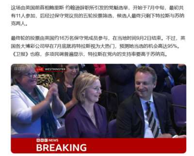 英国出了新首相,9月5日英国外交大臣伊丽莎白·特拉斯5日当选执政党保守党新党首,在获得女王伊丽莎白二世批准后将接任英国首相。保守党党员的投票结果显示,特拉斯的得票率为57.4%,击败竞争对手、前财政大臣里希·苏纳克。超过14万名保守党党员参加了投票。
