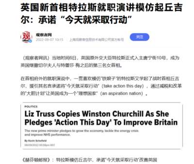在特拉斯阿姨的上任演说中,引用了丘吉尔在二战中的名言,我将在今天以及每一天都采取行动(take action this day and action every day),使之成为现实。把自己打扮出一副保守党嫡系传人的模样,只是试图模仿丘吉尔在二战范儿的政客也不是一个两个了,却没有一个获得他的盛名。