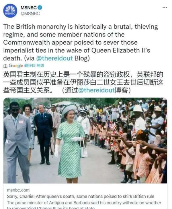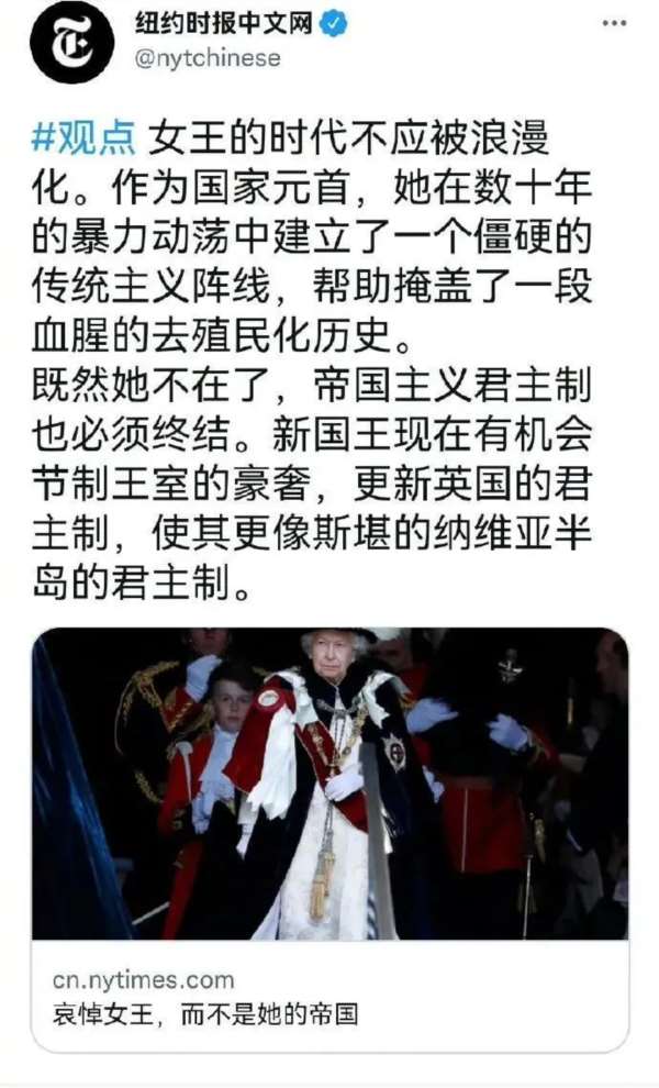 伊丽莎白二世对于史密斯的态度,就是她对这个世界的真实态度,在捍卫殖民帝国的角度,她和她的祖上没有什么区别,无论如何,她的存在,代表的都是那个血腥而残酷的殖民帝国。关于她的死,反倒是“真孝子”美利坚媒体纽约时报讲了几句真话,微软广播公司更是痛斥“英国君主制在历史上是一个残暴的盗窃政权”.......