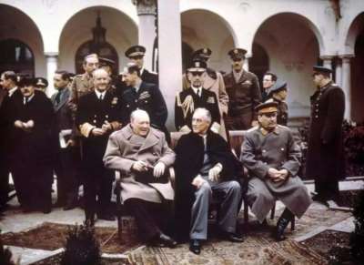 1945年,在克里米亚半岛的雅尔塔皇宫里,丘吉尔已经意识到大英帝国的衰落,他坐在罗斯福、苏大林的中间。