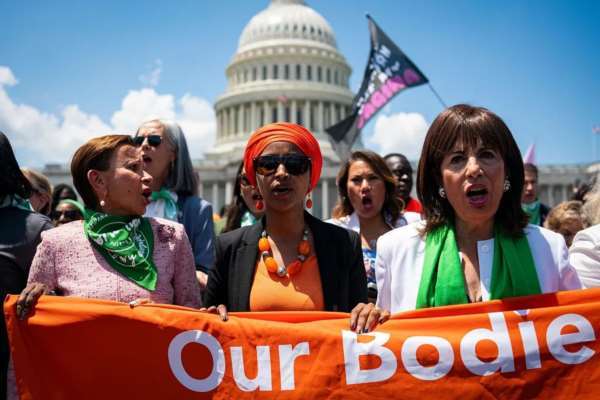 当地时间2022年7月19日,美国华盛顿特区,来自纽约的民主党众议员Nydia Velazquez,来自明尼苏达州的民主党众议员Ilhan Omar,和来自加州的民主党众议员Jackie Speier,在法院推翻罗诉韦德案的抗议活动中走向美国最高法院。